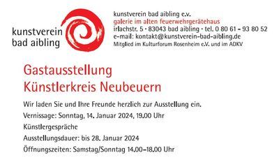 Öffnungszeiten: Freitag: 18 bis 20 Uhr Samstag: 14 bis 19 Uhr Sonntag: 11 bis 19 Uhr --------------------------------------------------- Einzelausstellung Neubeuern, Galerie am Markt, Marktplatz 4 Schichten - Geschichten - Geschichte ![]() Bri Oppel, Malerei Gast: Elisabeth Schmäling, Malerei 16. Februar bis 03. März 2024 Vernissage am Freitag, den 16. Februar, 19 Uhr Bri Oppel, Malerin, Kunsttherapeutin IHK Zürich, Mitglie des Künstlerkreises Neubeuern und als Gast Elisabeth Schmähling, Malerin, Ärztin, Psychotherapeutin zeigen Öl-, Acryl- und Gouache-Bilder. Das meditative abstrakte Malen bedeutet für sie eine Möglichkeit dem Gefühl der Hilflosigkeit und Bedrohung zu begegnen und mit ein wenig Schönheit, ein wenig Hoffnung zu einer Utopie von Frieden beizutragen. Öffnungszeiten: Freitag: 17 bis 20 Uhr Samstag: 14 bis 19 Uhr Sonntag: 11 bis 19 Uhr --------------------------------------------------------------- Sonderausstellung Gastausstellung